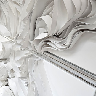 Le papier, travaillé en volume, capte la lumière et projette des ombres délicates, donnant vie à l’œuvre. Chaque relief, chaque texture joue avec la lumière naturelle, créant une dynamique fascinante et une profondeur captivante.